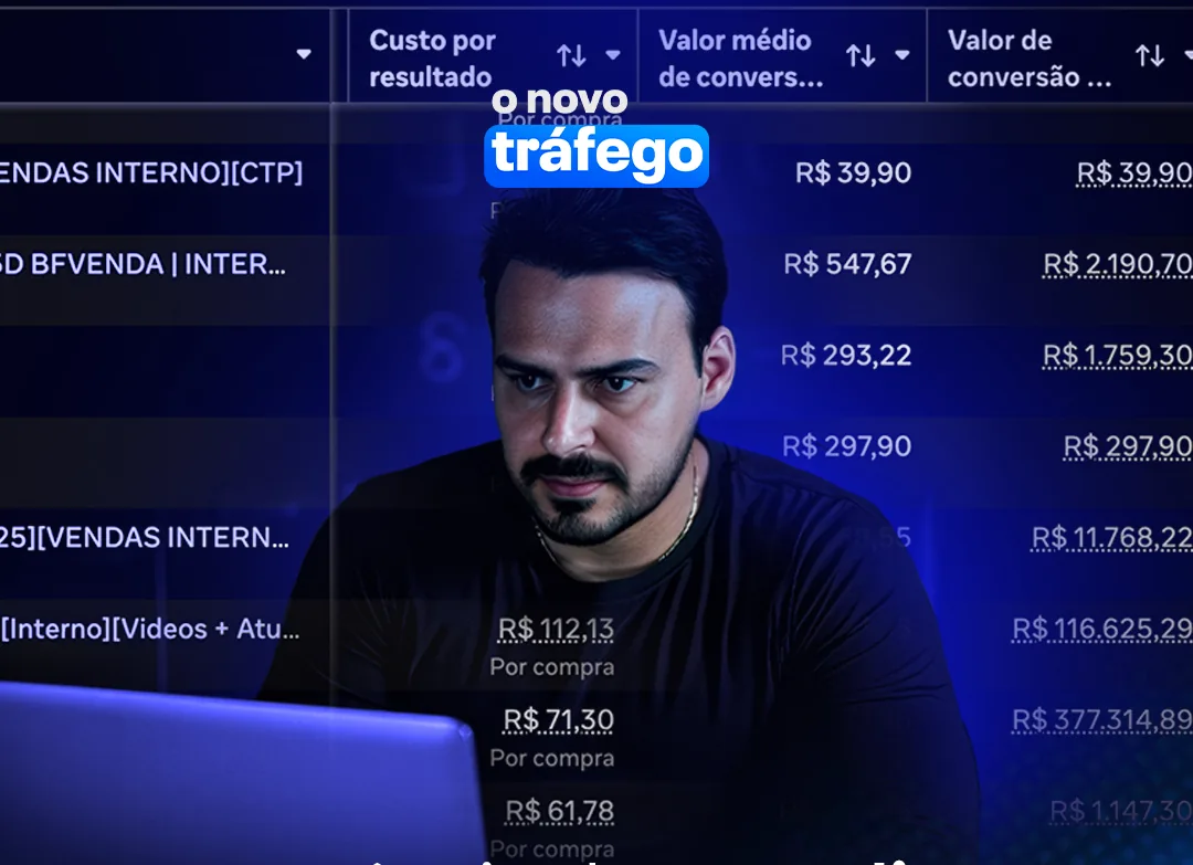 Eu comecei do zero. Sem dinheiro, sem contatos, sem faculdade de marketing. Aprendi tráfego pago na raça — testando, errando e acertando. Hoje, já gerenciei mais de R$50 milhões em anúncios e ajudei mais de 60 mil pessoas a mudarem de vida com essa habilidade.